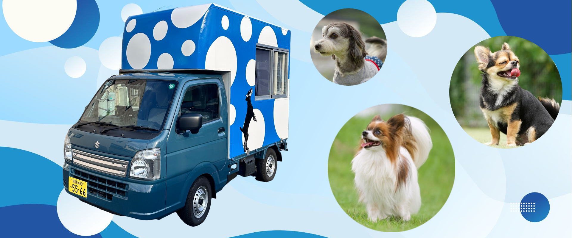 各種ハイスペック機材を積んだ専用シャンプーカーにて愛玩動物看護師がお宅までお伺いし、ワンちゃんを車内にお預かりして、おうちから目の届く場所で施術します。